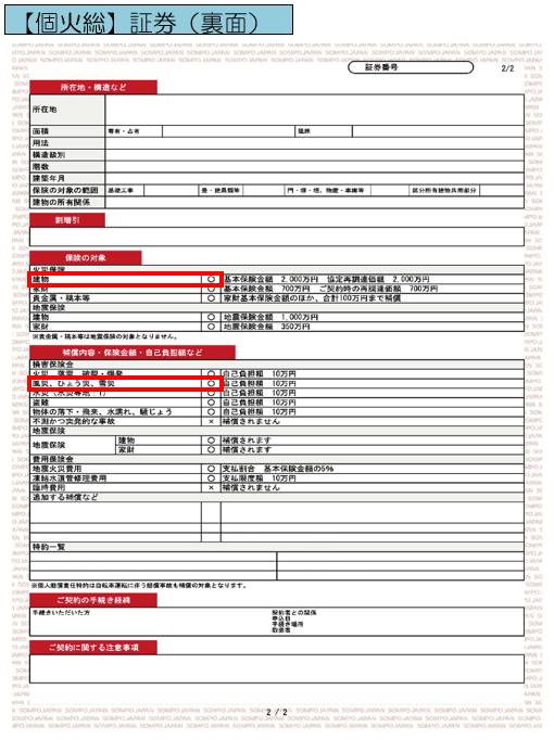 保険証券でご確認いただく場合は、以下サンプル画像の赤枠部分に〇がある場合に補償の対象となりますのでご参考にしてください。