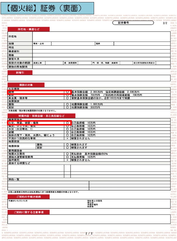 保険証券でご確認いただく場合は、以下サンプル画像の赤枠部分に〇がある場合に補償の対象となりますのでご参考にしてください。