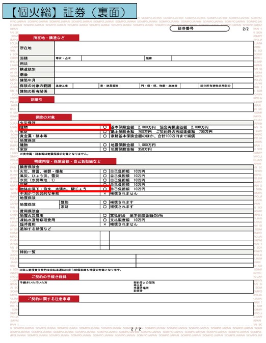 保険証券でご確認いただく場合は、以下サンプル画像の赤枠部分に〇がある場合に補償の対象となりますのでご参考にしてください。